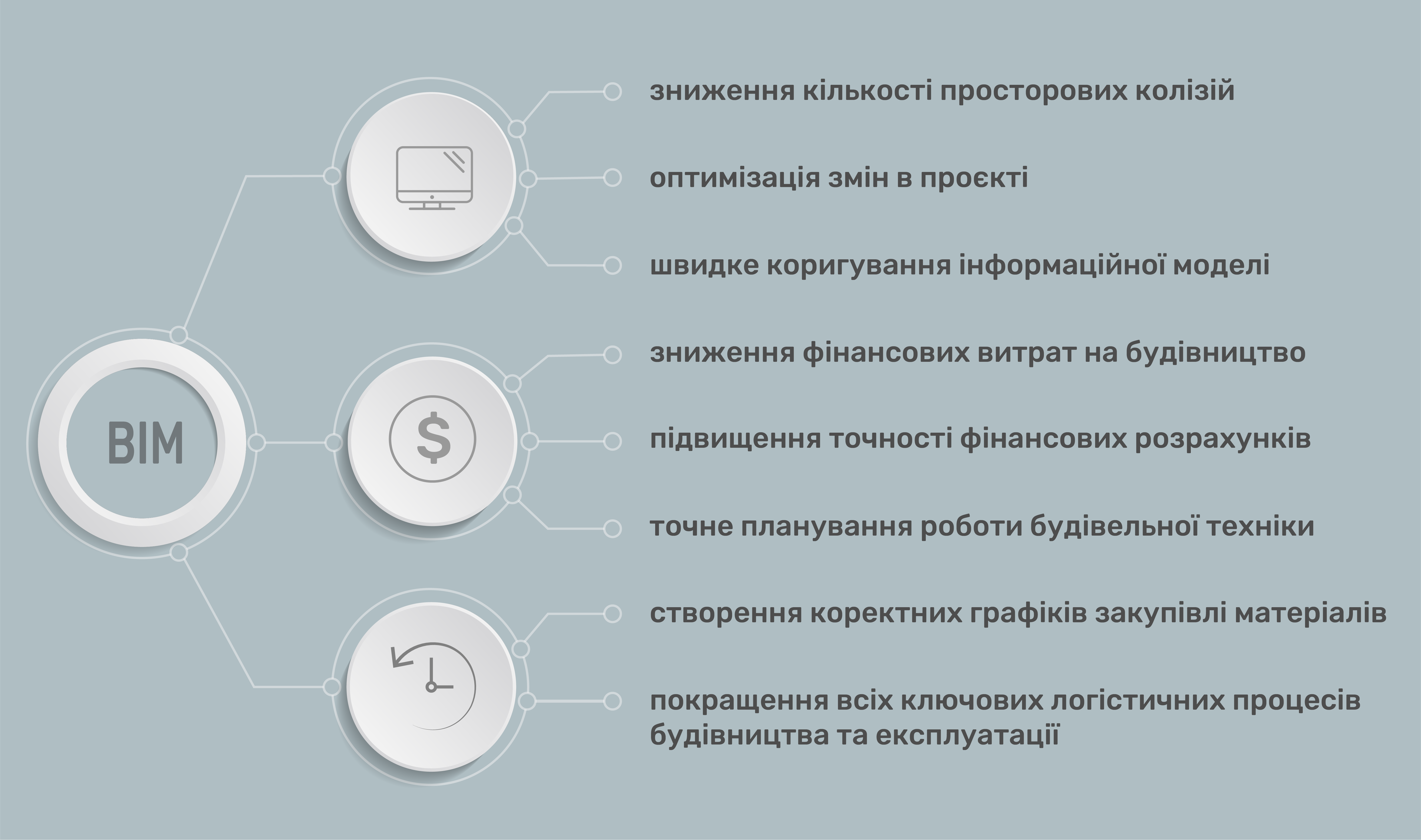 Технологія інформаційного моделювання будівель (BIM), полягає у створенні віртуальної моделі будівлі в цифровому вигляді, котра містить вичерпну інформацію про майбутній об’єкт. Застосування BIM-технології в проєктуванні – це збір та комплексна обробка архітектурних, конструктивних, технологічних та фінансових показників, завдяки чому проєкт, розглядаються як єдина інформаційна модель. (див. зображення нижче)