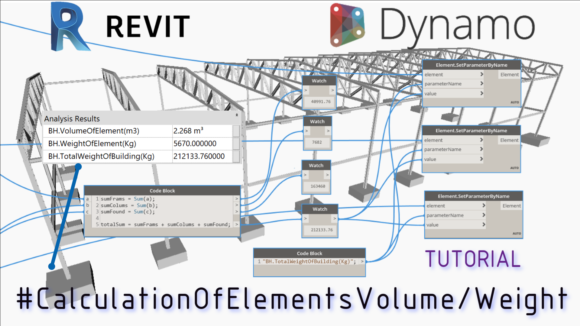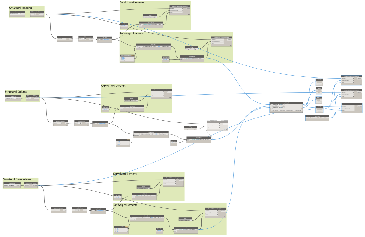 Цей скрипт Dynamo допомагає швидко розрахувати об’єм і вагу будь-якого елемента конструкції, що дуже цінно для подальших розрахунків проектування або калькуляції. Він також розраховуємо загальну вагу будівлі.